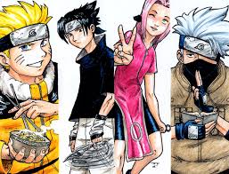 The main characters of Team 7 (counterclockwise, from left): Sasuke Uchiha, Sakura Haruno, Naruto Uzumaki, and team leader, Kakashi Hatake